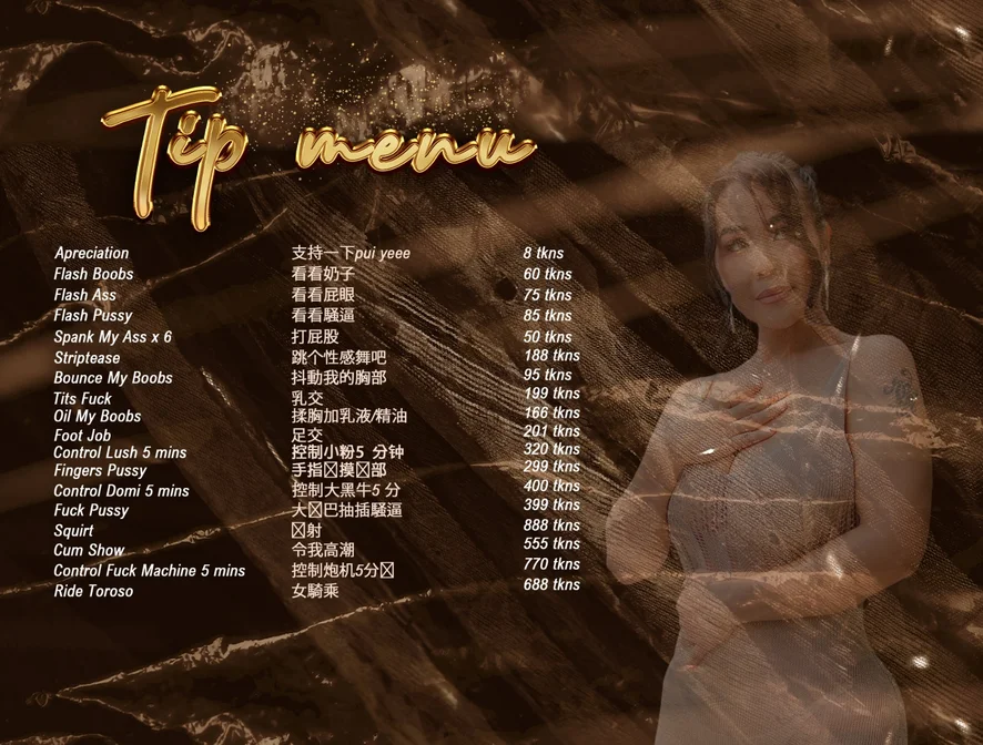 Meesteressen, Spanking, Striptease, Seksspeeltjes, Cameltoe, Dildo of vibrator, Voetfetisj, Dirty Talk, Rollenspel, Massage, Masturberen, Rokje omhoog, Hakken, Squirten, Op z'n Hondjes, Orgasme, Topless, Olie show, Deepthroat, Footjob